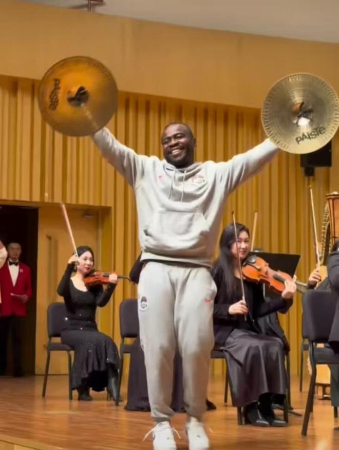 河南足球俱乐部外籍助理阿基姆·彭现身河南郑州大剧院,双手敲击铙钹,哈哈大笑。观众:下个演出季你可能会转入交响乐团。