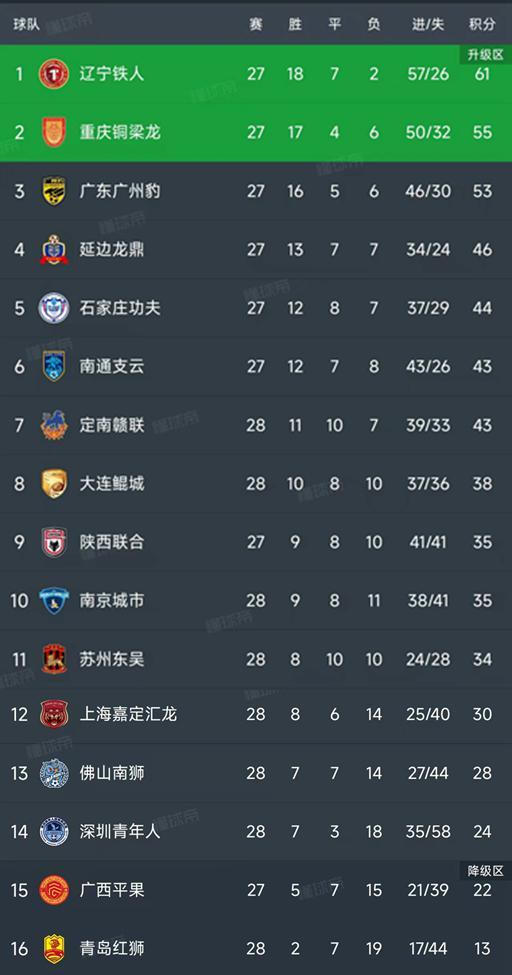 北京时间10月26日,中甲第28轮比赛以四场比赛结束。最新排名如下!最新中超积分榜显示,陇南联队与大连坤辰队面临位置争夺战。两支球队都是中游球队,你不能要求更多了。主场作战的定南甘肃联队主场2-1战胜大连坤辰。上半场第17分钟,埃里克斯的进球首开纪录。下半场第72分钟,多米尼克·维尼修斯扳平比分。 8分钟后,埃里克斯反击再进一球,锁定球队二连胜。目前定南甘联以11胜10平7负积43分排名第七,大连坤辰以10胜8平10负积38分排名第八。定南赣西联赛第七名的苏州苏州队客场2-0战胜了保级奋战的深圳青年队。袁俊杰和王一凡进球。苏州 苏州积34分暂列第11位,积3分结束连胜。深青已遭遇六场失利,连续七场比赛未尝胜绩。目前他们仅积24分,排名倒数第三。至少他们和广西平果是另外的保级热门候选。广西平果目前积22分。他们本轮的比赛还没有开始。我们将在主场迎战积分榜第四位的延边龙超!苏州全取三分。佛山南狮也是一支降级球队。他们在主场2-1击败上海嘉定汇龙,掌握了自己的命运。第3分钟,郑俊伟攻入一球。阿瓦拉辛在下半场第63分钟的进球锁定了胜利。第89分钟,科菲帮助上海嘉定汇龙进球。佛山南狮队两轮不胜,目前积28分排名第13位。是一场胜利。他们已经与广西平果有6分的差距,正在逼近降级区。输球的上海嘉定汇龙积30分排名第12位。他们基本上成功保级了!南京市已经确认了第二次、第三次垫底的青岛红狮队降级。主场对阵南京城,他们曾短暂2-0领先,但连续丢了3球,最终2-3落败。他们已经8场比赛未尝胜绩,胜分维持在13分。两连胜,南京市积35分排名第十。