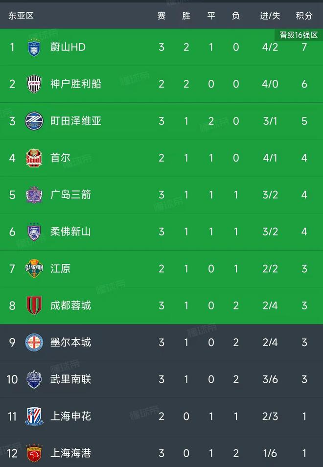 北京时间10月21日,亚冠精英联赛进入第三轮。我们来看看东亚地区最新的排名变化。主要信息如下:成都0-2新山、上海港0-2町田泽维尔、蔚山HD 1-0广岛三箭、墨尔本城2-1武里南联。最新亚冠联赛精英联赛积分榜。当天交锋的两支球队中超成功队和海钢队在主场均未能取得进球。成都队主场0-2不敌马来西亚新山队。本场比赛成都队的首发阵容出现了较大的更替。胡河涛也受伤了,一开始就受伤了。撤退后,一般很难与对手抗衡。上半场第5分钟,门德斯迅速将球让给阿里巴斯,下半场第62分钟,门德斯横扫再得一分。最终,成都遭遇主场首败、亚冠第二败。ns联盟。目前他们以1胜2负积3分排名第八。新山首次夺得亚冠联赛冠军,以1胜1平1负积4分升至第6位。荣成主场失利,上海港主场对阵日本球队町田泽维尔也无法取得任何优势。比赛中没有像样的射门,几乎被包围。射门次数为2比16。上半场第13分钟,傅帆意外打进乌龙球,第25分钟,相马由纪远射破门。最终凯波特0-2落败,豪取三连胜。目前球队战绩1平2负积1分垫底。町田泽维尔首次获胜,以1胜2平积5分升至第3位。海港队三场比赛未尝一胜,排名垫底。目前的领先者是蔚山HD。后者主场1-0险胜广岛三箭。金美n-hyuk打进了唯一的进球。蔚山HD以2胜1平积7分升至榜首。广岛三箭遭遇首败,积4分,1胜1平1负暂列第5位。排名第一的蔚山HD队在主场对阵澳大利亚墨尔本城队,取得了主场首胜。下半场第72分钟失球后,凭借拉沙尼和卡普托的进球,2-1击败武里南联,以1胜2负积3分排名第九。武里南联队战绩与墨尔本城队相同,均为1胜1平1负。暂定第十名,明天上海申花将在主场迎战韩国首尔队!