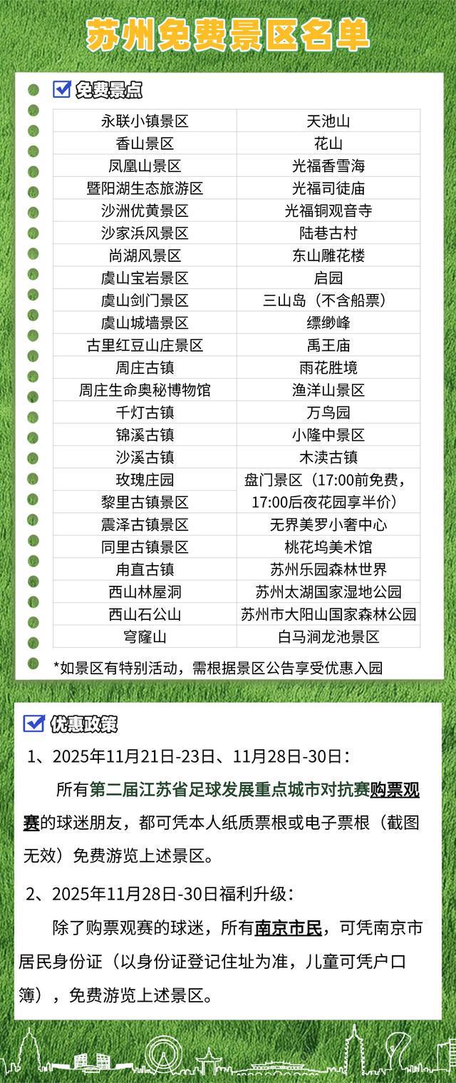 现代快报讯(记者高达)苏超联赛依然火热,足球运动再次蓬勃发展。 11月22日至29日,南京和苏州这两个足球发展的重要城市将再次相聚。江苏省足球发展重点城市邀请赛将通过主客场两场比赛来收官今年江苏足球的决赛。大战即将打响,但苏州对球迷的热爱却是在意料之中。现代快报记者从苏州旅游和文化广播局获悉,2025年11月21日至23日、11月28日至30日,球迷凭“江苏省足球发展重点城市邀请赛”票根,可免费游览苏州40多个景点。苏州将于11月29日主场迎战南京。为欢迎南京市民来苏州观赛,2025年11月28日至30日,南京市民将可游览40多个景点凭南京市居民身份证免费(儿童可按身份证上登记的地址提交户口簿)。另外,现在正是欣赏秋叶的时候。苏州天平山和南京栖霞山的红枫实在是太美了,两个景区联合推出了互动活动,栖霞山和天平山免费入场政策。 11月24日至27日,持景区打印或电子门票存根,可免费进入其他景区。 11月22日至29日市赛期间,凭纸质票根或电子票根观看比赛,可免费进入栖霞山风景区。比赛期间,足球夜市将继续在苏州地铁广锦南路站举办。餐厅位于广津南路站的室外区域(靠近原3号出口)最近进行了更新,打造了一个独特的沉浸式室内营地式比赛观看空间,名为“星空营地”。空间内装饰着让人想起星空的柔和灯光,露营桌椅随意放置。您无需出门,就能沉浸在“星空下看球”的独特体验中。届时,场馆移动大屏将同步直播整个赛事,高清捕捉每一个攻防瞬间、每一个进球的每一个精彩瞬间。我们和众多粉丝一起在“星空”穹顶下齐声呐喊。奉献爱心,沉浸在足球、碗赛和嘉年华的激情之中。同时,苏州文旅将继续与滴滴出行合作发放出租车优惠券。图片提供:苏州文化广电旅游局